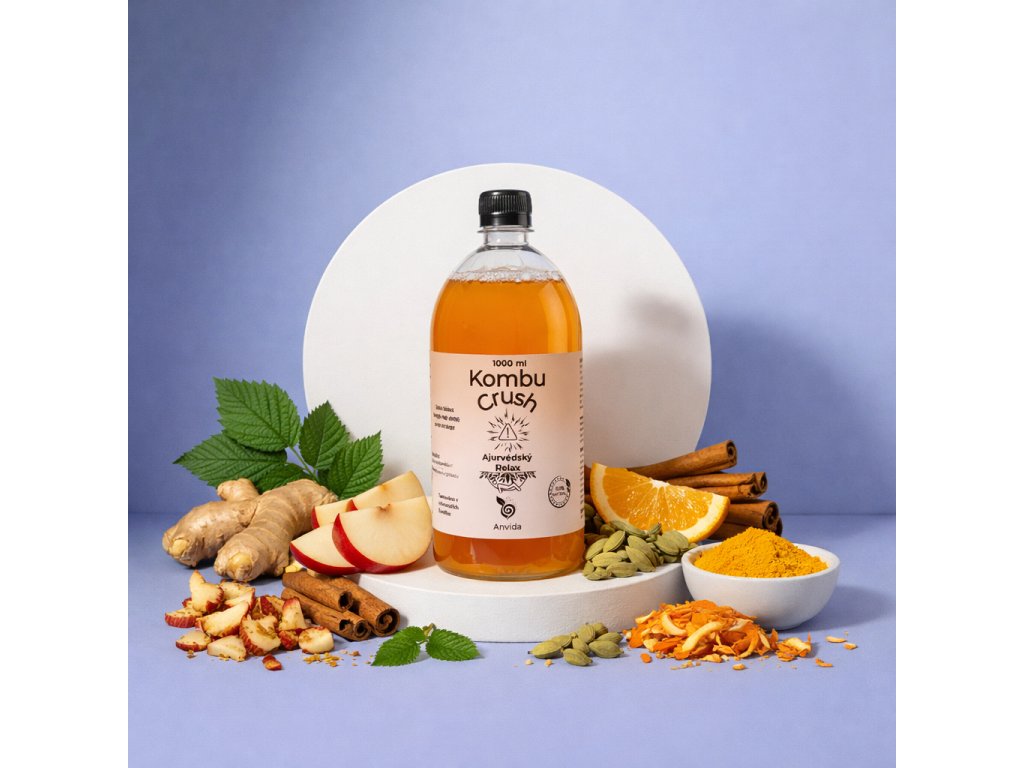 Fermentovaný výluh( pitná voda, černý čaj, bílý cukr, bylinný čaj: kousky jablka 37 %, zázvor, skořice 5 %, kardamom, pomerančová kůra, kurkuma 5 %, listy ostružiníku, přírodní aroma, citrónová kůra 1 %, nové koření, hřebíček, kultura symbiotických bakterií a kvasinek), oxid uhličitý